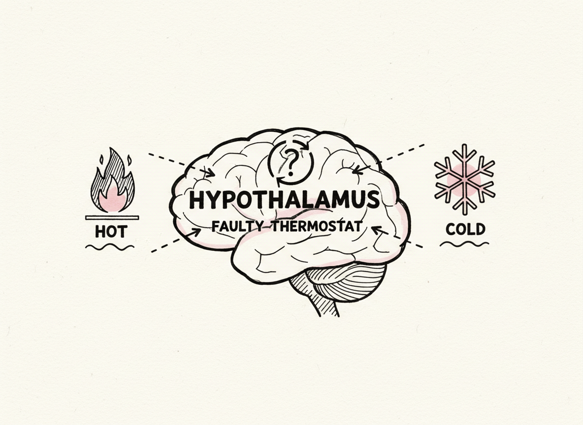 가장 먼저 이해하셔야 할 것은, 이 증상이 여러분의 잘못이나 성격 탓이 아니라는 점입니다. 우리 뇌에는 '시상하부'라는 체온 조절 센터가 있습니다. 평소라면 외부 온도에 맞춰 체온을 일정하게 유지해주죠. 하지만 폐경기가 다가오면 난소 기능이 저하되면서 여성 호르몬인 에스트로겐 분비가 급격히 줄어듭니다.
