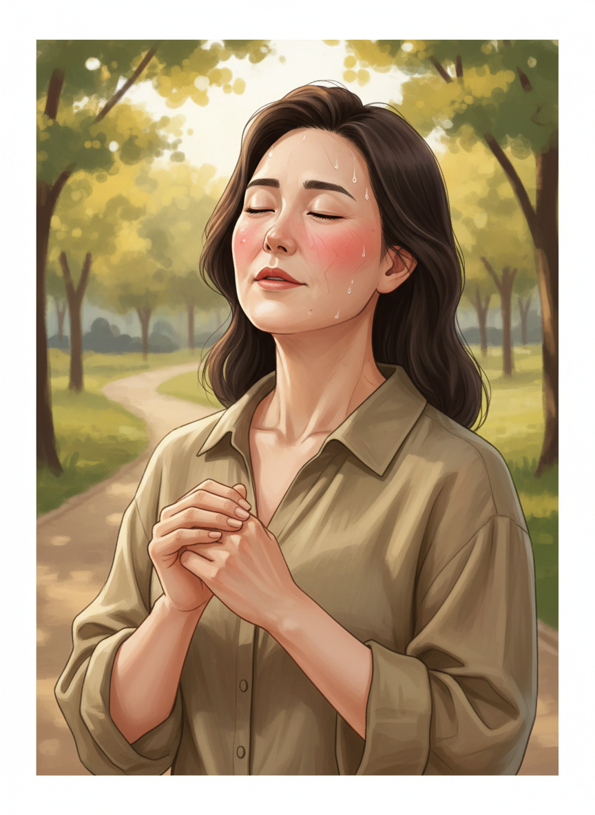 이 에스트로겐이 줄어들면 시상하부가 오작동을 일으킵니다. 아주 작은 온도 변화나 감정 변화에도 민감하게 반응하여, 뇌는 "어? 몸이 너무 뜨겁다!"라고 착각하고 비상벨을 울립니다. 그 결과 열을 식히기 위해 혈관을 확장시키고 땀을 배출하게 되는데, 이것이 바로 우리가 겪는 안면홍조와 발한 증상입니다. 즉, 내 몸은 지금 더위를 식히려고 필사적으로 노력 중이라는 사실을 먼저 이해하고 다독여주는 것이 중요합니다.