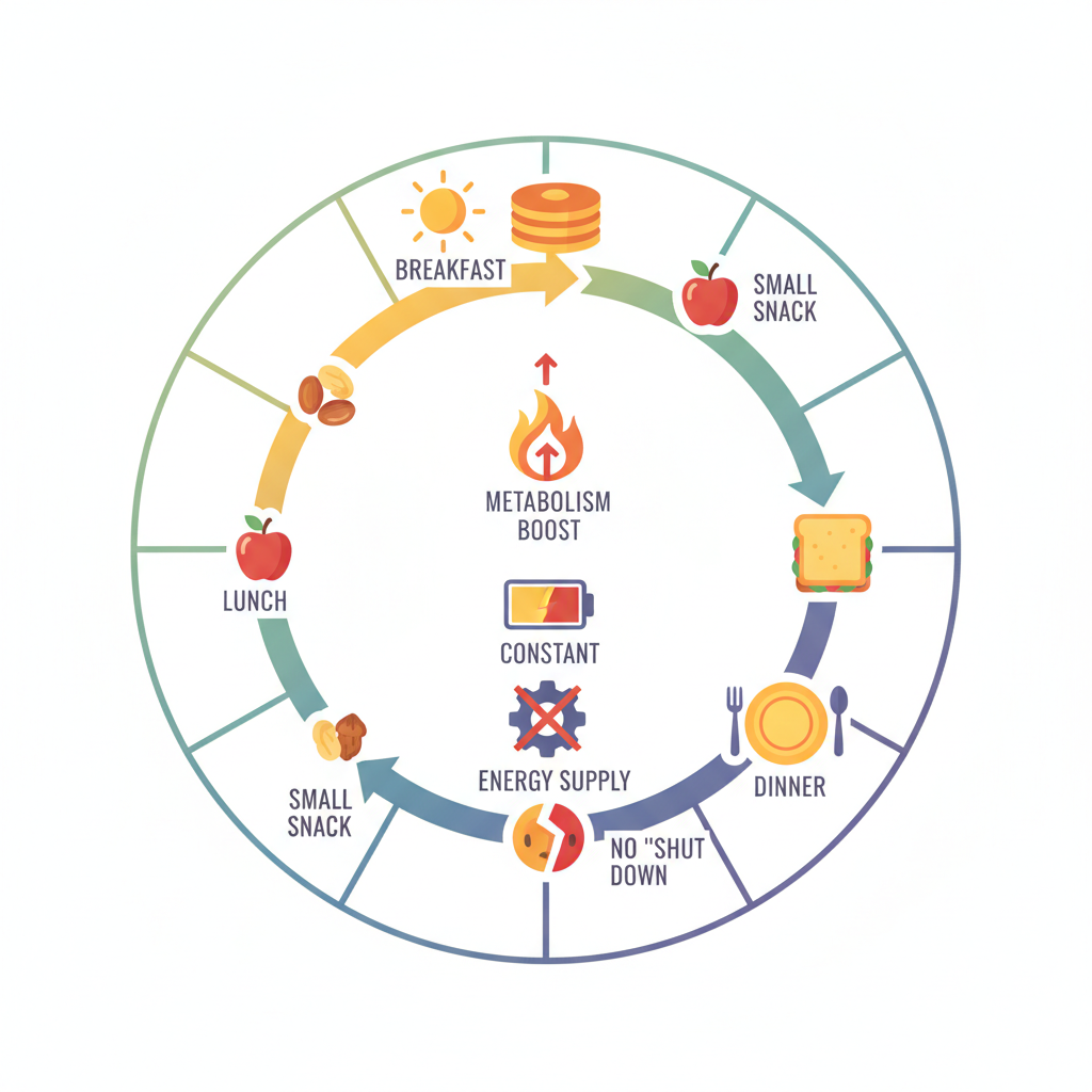 굶는 다이어트가 최악인 이유가 여기 있습니다. 우리 몸은 영리해서, 음식이 들어오지 않으면 '비상사태'를 선포하고 대사량을 급격히 낮춰 에너지를 비축하려 합니다. 이것이 바로 요요현상의 주범입니다. 규칙적인 식사는 몸에게 "에너지가 계속 들어오니 아끼지 말고 태워도 돼"라는 신호를 주는 것과 같습니다. 조금씩 자주 먹는 것이 한 번에 몰아 먹는 것보다 대사율 유지에 유리합니다.