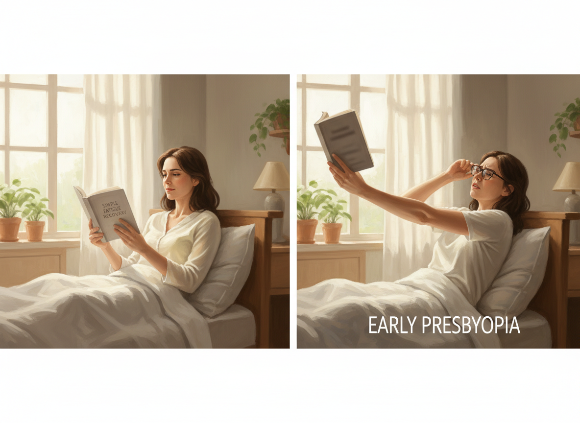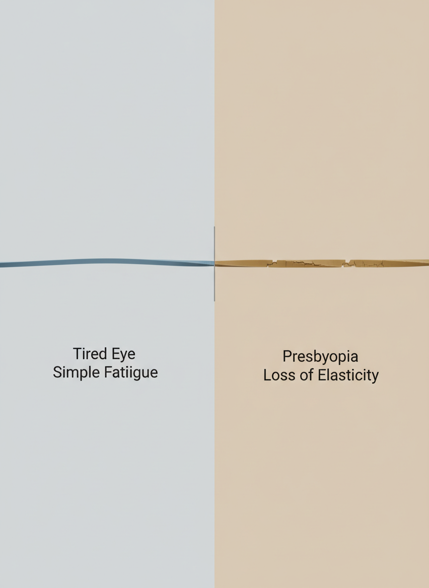 가장 쉬운 구분법은 '회복 탄력성'입니다. 충분히 자고 일어난 주말 아침에는 눈이 맑다면 단순 피로(조절 장애)일 가능성이 높습니다. 반면, 컨디션과 상관없이 가까운 글씨가 지속적으로 흐릿하고 오히려 멀리 볼 때 눈이 편안하다면 노안의 초기 증상을 의심해봐야 합니다. 마치 고무줄이 낡아서 탄력을 잃은 것처럼 수정체의 탄성이 영구적으로 떨어진 상태인 것이죠.