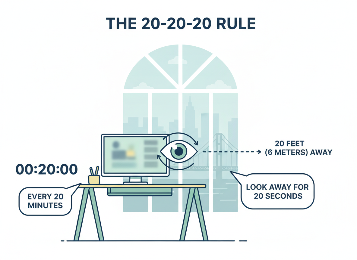 - 20-20-20 법칙 준수: 미국 검안협회에서 권장하는 가장 확실한 방법입니다. 20분마다, 20피트(약 6m) 밖을, 20초 동안 바라보세요. 멍하니 먼 산을 바라보는 것만으로도 뭉친 모양체 근육이 스트레칭되는 효과를 볼 수 있습니다.