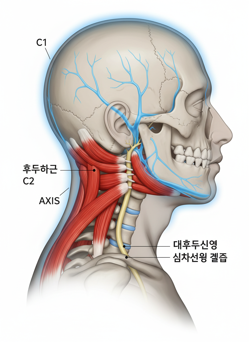 혹시 지금 이 글을 읽고 있는 순간에도 습관적으로 뒷목을 주무르고 계시진 않나요? 마치 누군가 목덜미를 꽉 움켜쥔 채 놓아주지 않는 듯한 묵직한 통증, 그리고 곧이어 관자놀이나 정수리를 타고 흐르는 불쾌한 두통. 우리는 흔히 이를 '스트레스 탓'으로 돌리고 진통제 한 알로 해결하려 합니다. 하지만 단언컨대, 뒷목 통증을 동반한 두통은 단순한 컨디션 난조가 아닙니다. 그것은 당신의 경추(목뼈)가 보내는 일종의 '경고장'입니다.