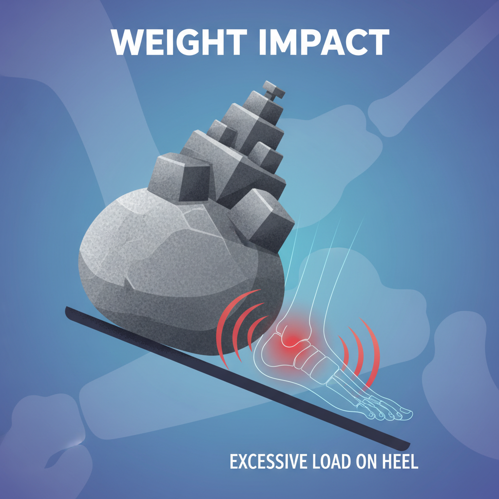 체중 증가는 발에 가해지는 부담을 늘려요. 발뒤꿈치는 체중을 지탱하는 부위라 과체중은 족저근막염이나 지방 패드 위축을 악화시킬 수 있습니다. 건강한 체중 유지가 발 건강에 필수적이에요.