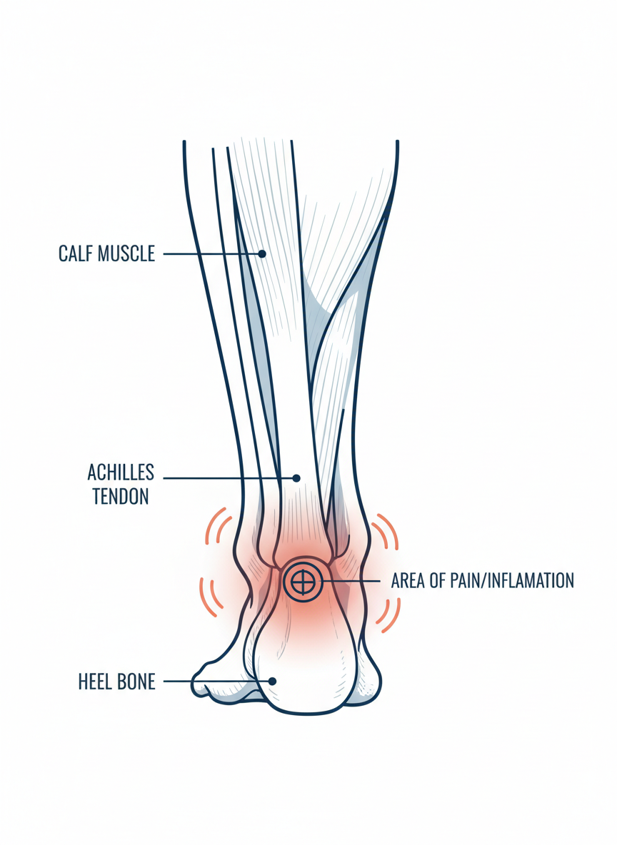 발뒤꿈치 위 아킬레스건 염증이나 파열도 통증 유발합니다. 갑작스러운 운동량 증가나 잘못된 자세가 주원인이며, 주로 뒤꿈치 위쪽 통증과 함께 부종, 열감이 동반될 수 있어요.