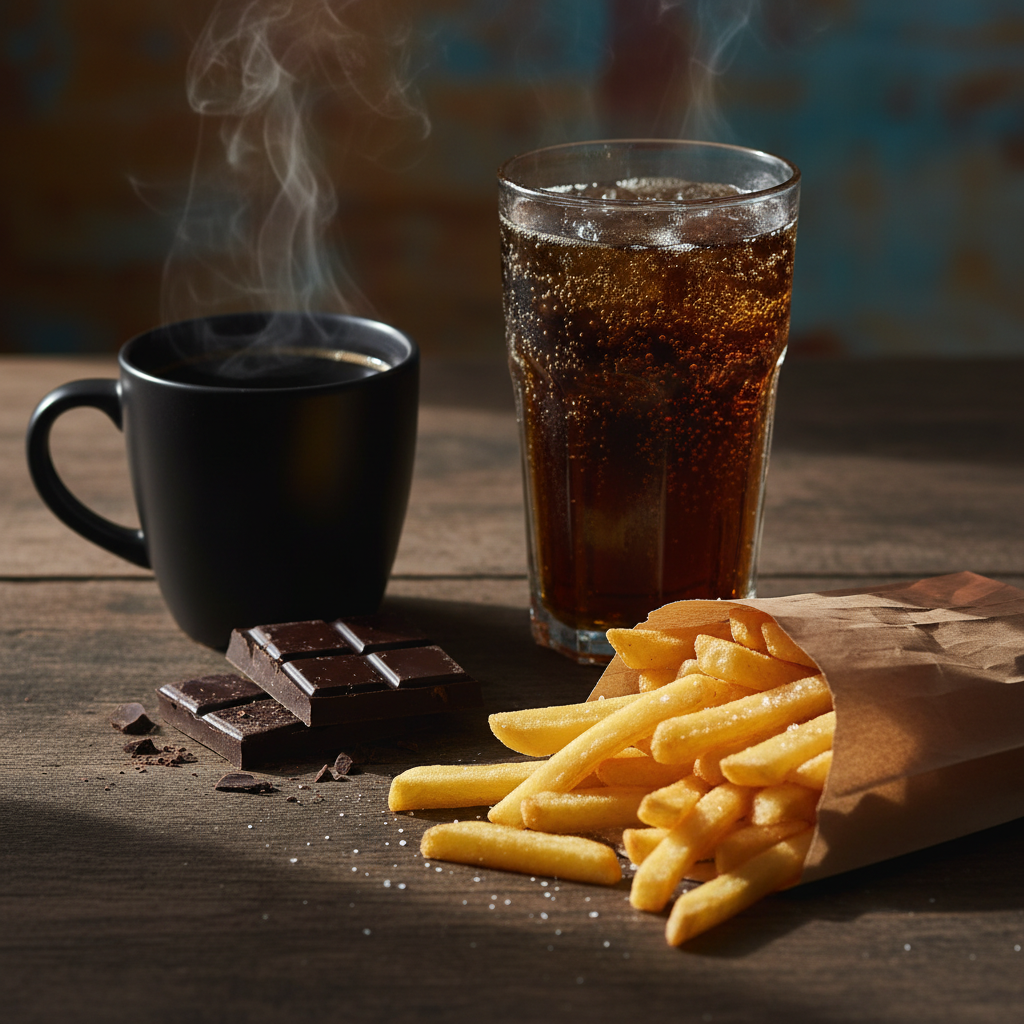 | 종류 | 양배추, 감자, 마, 브로콜리 | 커피, 초콜릿, 탄산음료, 튀김 |