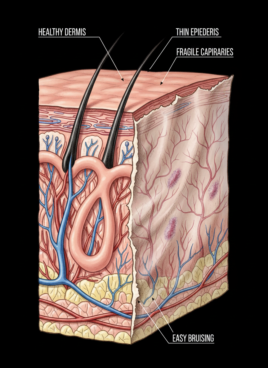 4. 피부가 종이처럼 얇아져요, 피부 위축과 멍