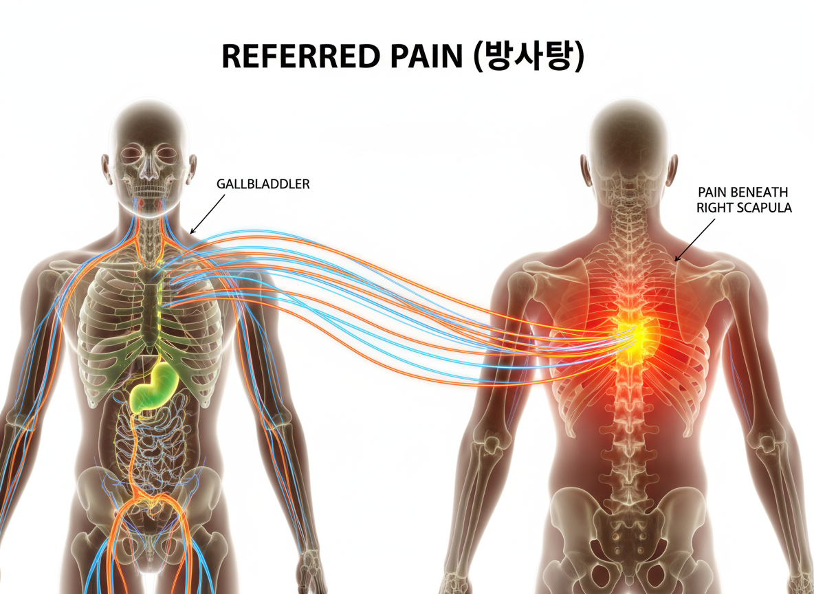 | 오른쪽 윗 등 (날개뼈 주변) | 담낭 질환, 폐 질환, 근육통, 척추 질환 (경추/흉추) | 식후 통증, 호흡 시 악화, 목 어깨 통증 동반, 자세 관련 |