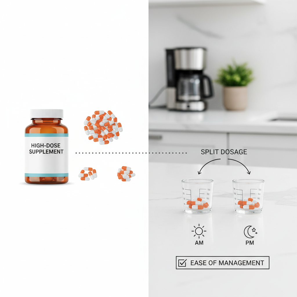 • 고용량 분할 섭취: 한 번에 많이 먹기보다 나누어 먹으면 부담이 적습니다.