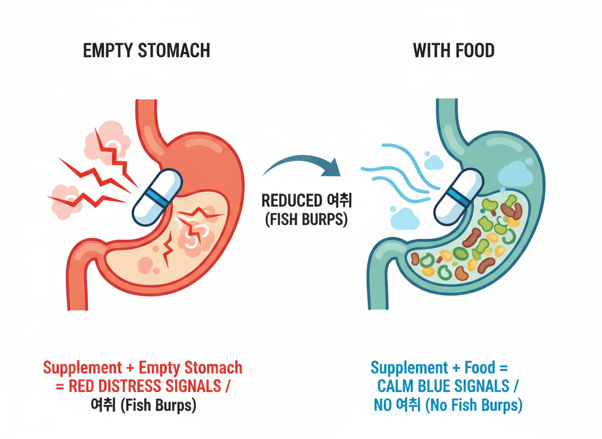 • 식사 직후 섭취: 지방과 함께 흡수율을 극대화하고 어취를 줄입니다.