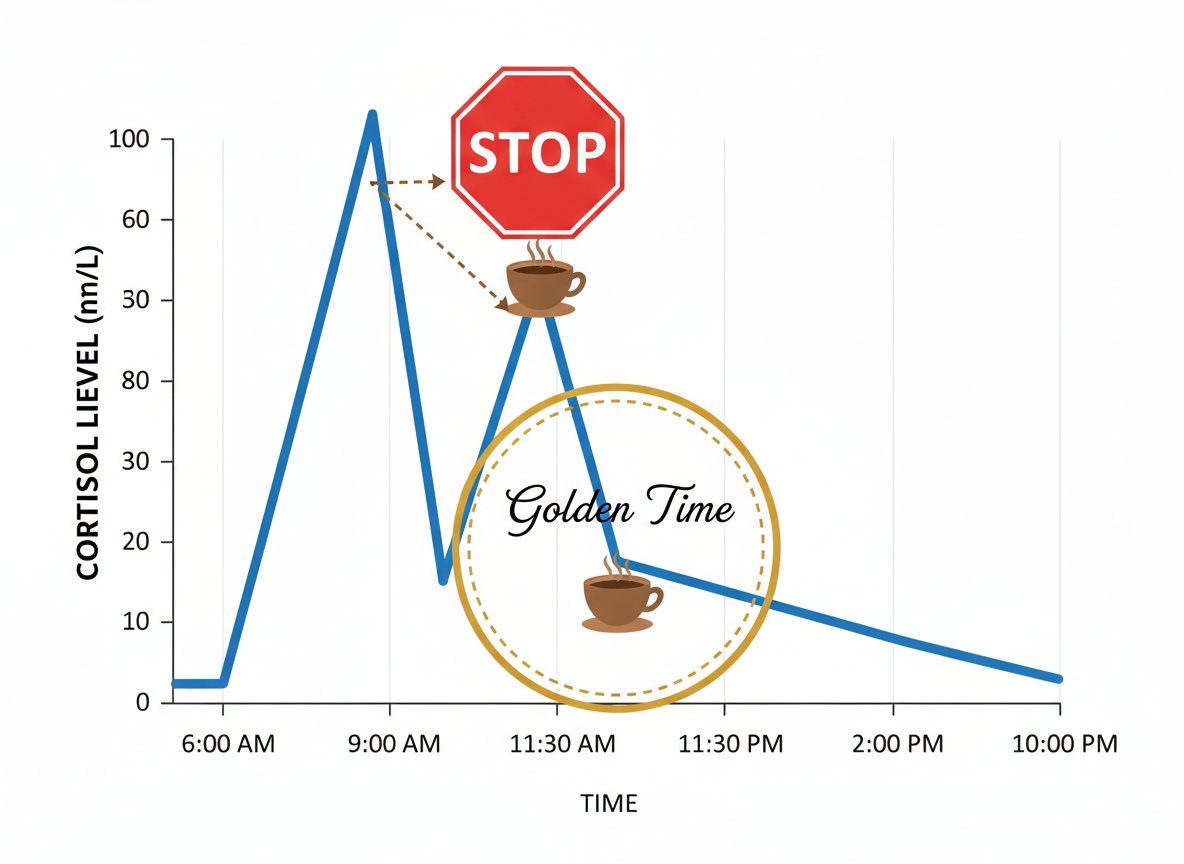 1. 타이밍이 생명입니다: 기상 직후보다는 코르티솔 수치가 떨어지는 오전 9시 30분 이후를 노리세요.2. 위장을 보호하세요: 빈속에 마시는 '모닝커피'는 위장에 독이 될 수 있습니다. 간단한 견과류나 식사 후에 즐기세요.