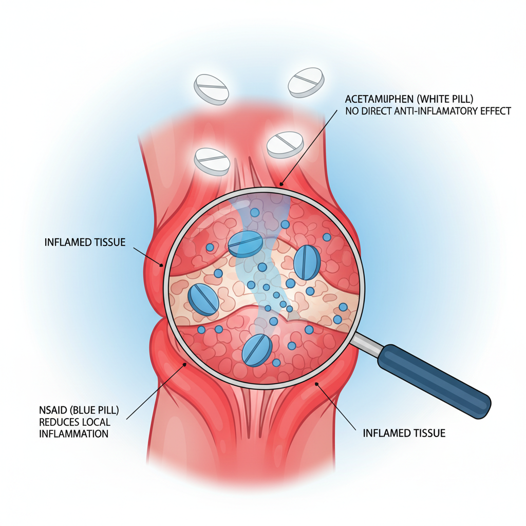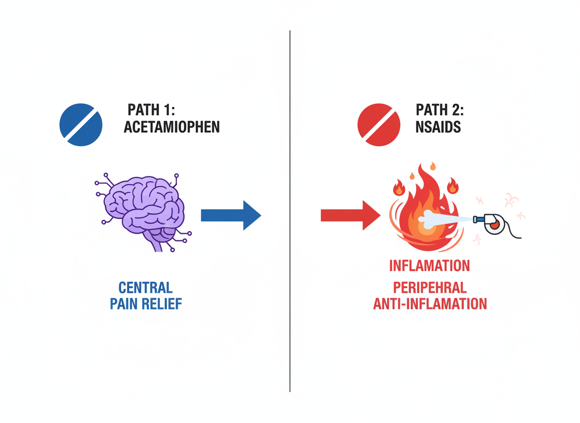 많은 분들이 진통제는 다 비슷하다고 생각하시지만, 결정적인 차이가 하나 있습니다. 바로 '염증'을 잡느냐 못 잡느냐의 문제입니다. 우리가 흔히 비교하는 부루펜이나 아스피린 같은 소염진통제(NSAIDs)는 통증과 함께 염증을 가라앉히는 효과가 있습니다. 하지만 타이레놀의 주성분인 아세트아미노펜은 뇌의 중추신경계에 작용하여 통증을 느끼는 역치를 높이고 열을 내리는 작용을 할 뿐, 말초 조직의 염증을 직접적으로 치료하지는 못합니다.