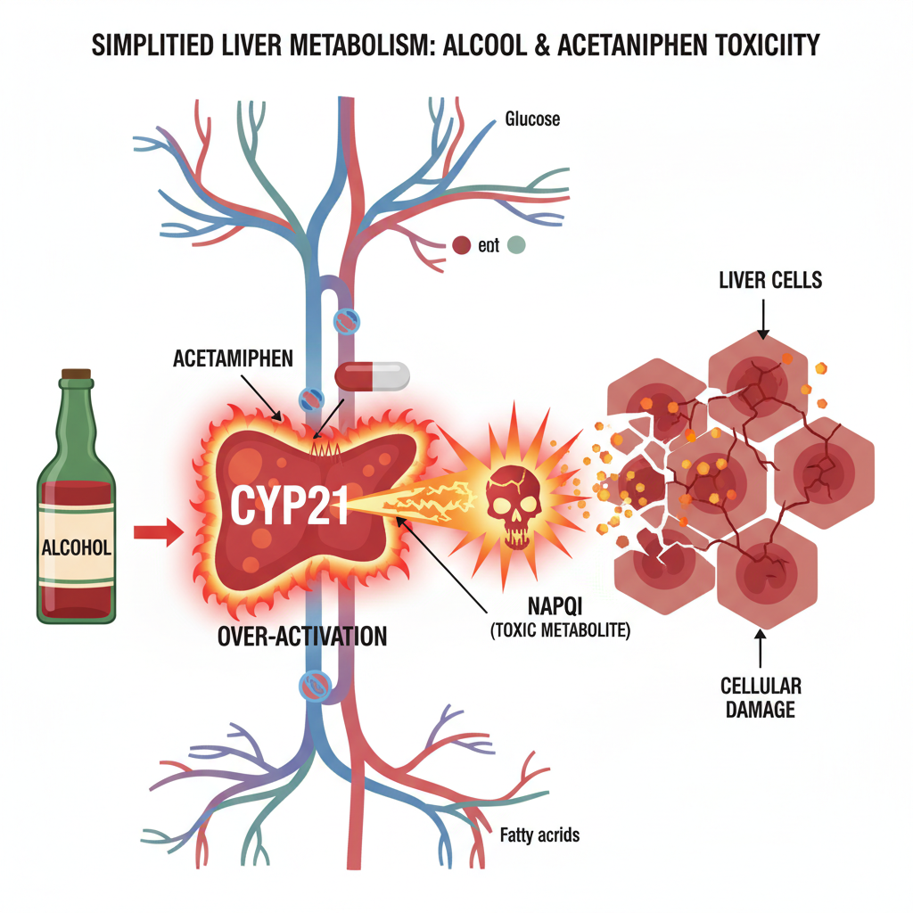 평소라면 우리 몸은 약 성분을 무해하게 처리하여 배출합니다. 하지만 술을 마시면 간은 알코올을 분해하느라 'CYP2E1'이라는 효소를 과도하게 활성화시킵니다. 이 상태에서 타이레놀이 들어오면, 이 약 성분은 평소와 다른 경로로 대사 되어 'NAPQI'라는 강력한 독성 물질로 변해버립니다.